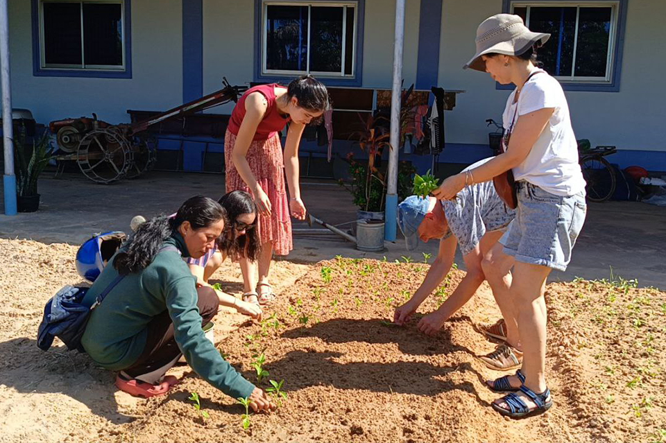 Harvesting rice, planting vegetable crops, watering, and harvesting vegetables.